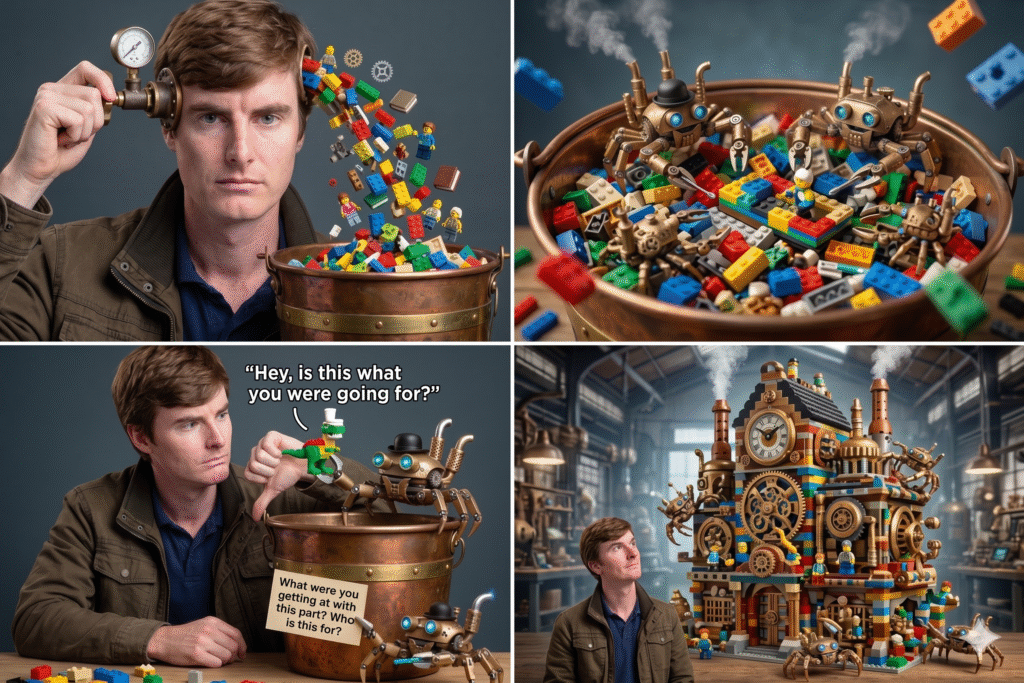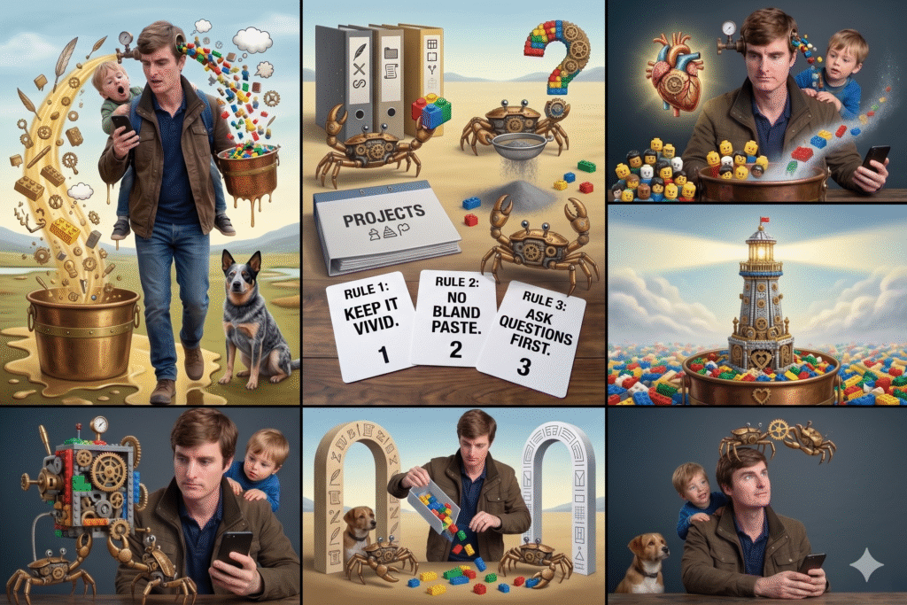 The crabs are Claude. The Legos are words. The bucket is a project I set up with specific instructions. And the finished building is mine.
