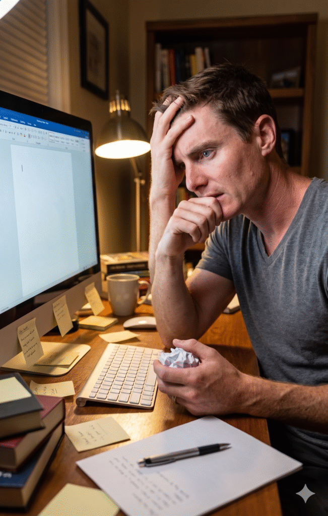 Now generate an image of this same man sitting at a computer, looking frustrated and clearly having a difficult time thinking of what to write.